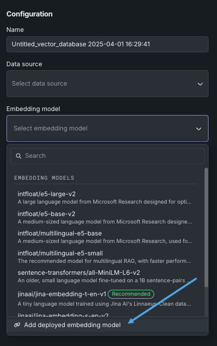| Add deployed embedding model | Select a deployed embedding model to use during vector database creation. Column names can be found on the deployment's overview page in the Console. |