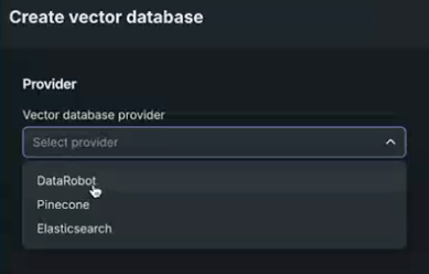 DataRobot allows direct connection to either Pinecone or Elasticsearch external data sources for vector database creation. In this case, the data source is stored locally in the Data Registry, configuration settings are applied, and the created vector database is written back to the provider. Select your provider in the Create vector database modal.