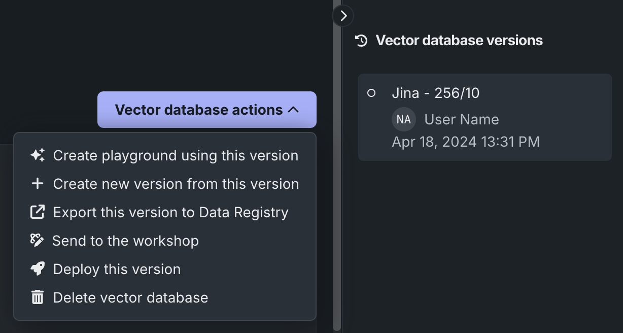 | Create new version from this version | Creates a new version of the vector database that is based on the version that is currently selected. |