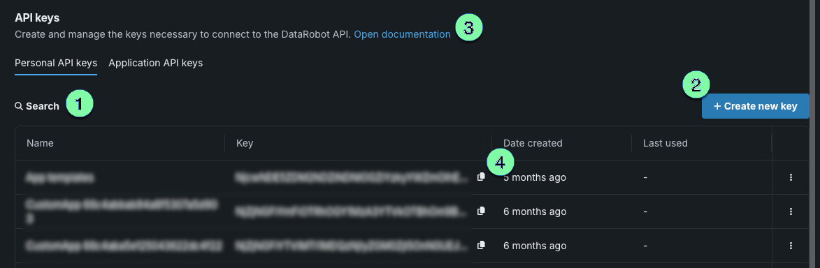 | 4 | Copy | Copy a key to your clipboard (contents blurred out in this image) to paste elsewhere. |