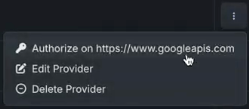 Open the Actions menu on the right-hand side of the OAuth provider management table in the row containing your provider and select Authorize on NAME (NAME will vary based on the provider of the service).