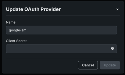 Open the Actions menu on the right-hand side of the OAuth provider management table in the row containing your provider and select Edit OAuth provider.