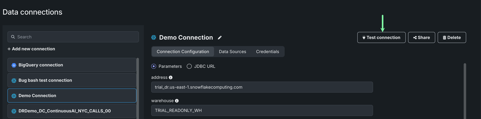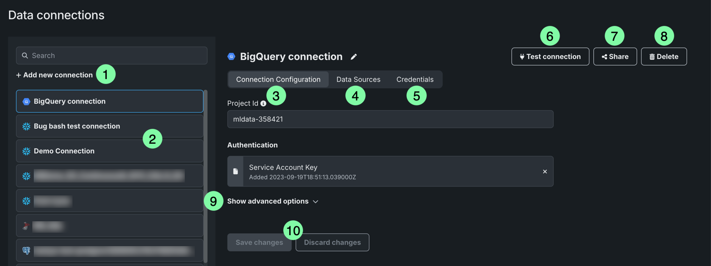 | 6 | Test connection | Tests the data connection configuration, including authentication credentials. |