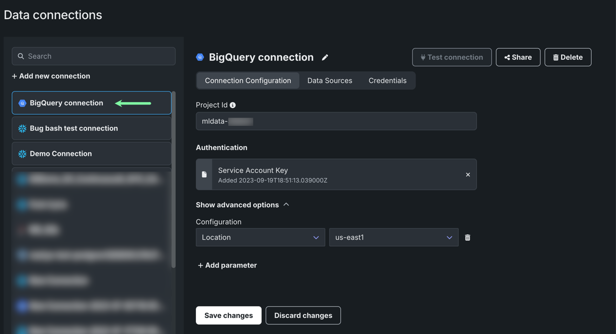 | 9 | Show advanced options | Allows you to add parameters to the connection configuration. |