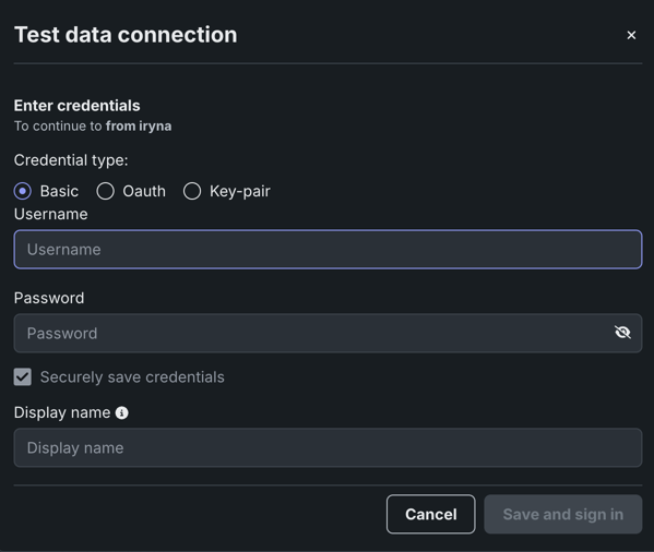 To create new saved credentials, select your a data connection from the list on the left and click Test connection.