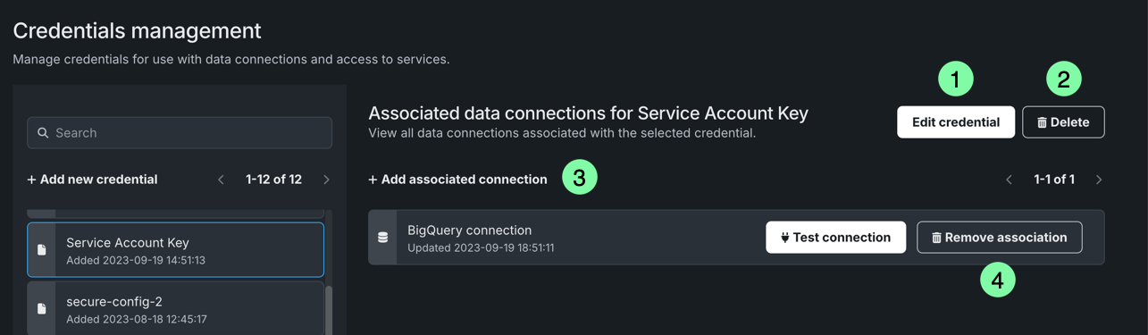 | 4 | Remove association | Removes the association between a data connection and specific credentials. If you are removing all data connections for the associated credentials, you will receive a message prompting you to delete the credentials. You can decide to remove the credentials or leave them without any associated connections. |