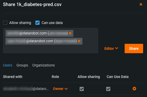 To increase collaboration, you can share assets with other DataRobot users, groups within your org, and with the entire organization. However, note that it is required that users and groups must belong to the same organization when sharing. See tenant isolation and collaboration for details.