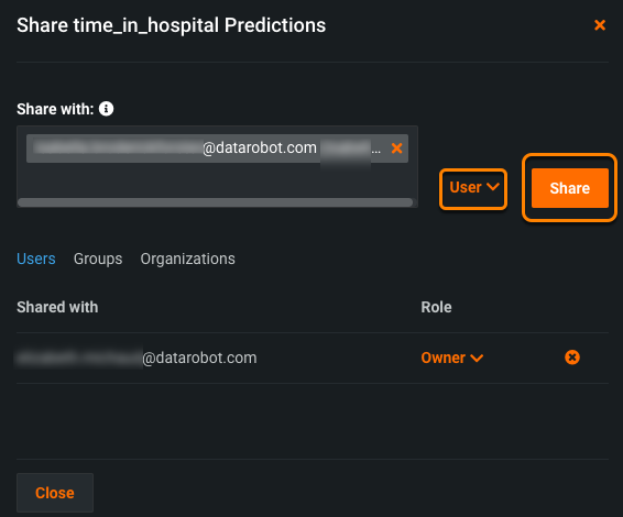 When you invite a user, user group, or organization to share a project, DataRobot assigns the default role of User or Editor to each selected target (See Roles and permissions for more information).