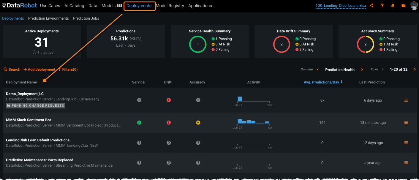 Click the Deployments tab (top menu) to list all deployments to which you are subscribed.