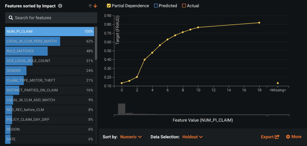 The partial dependence plot in Feature Effects shows that the larger the number of personal injury claims (NUM_PI_CLAIM), the higher the likelihood of fraud. As expected, when a claim matches internal red flag rules, its likelihood of being fraud increases greatly. Interestingly, GENDER and CLAIM_TYPE_MOTOR_THEFT (car theft) are also strong features.