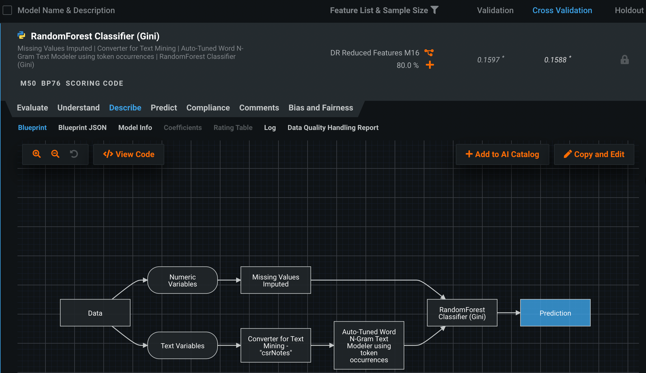 Click on a model to reveal the model blueprint—the pipeline of preprocessing steps, modeling algorithms, and post-processing steps used to create the model.