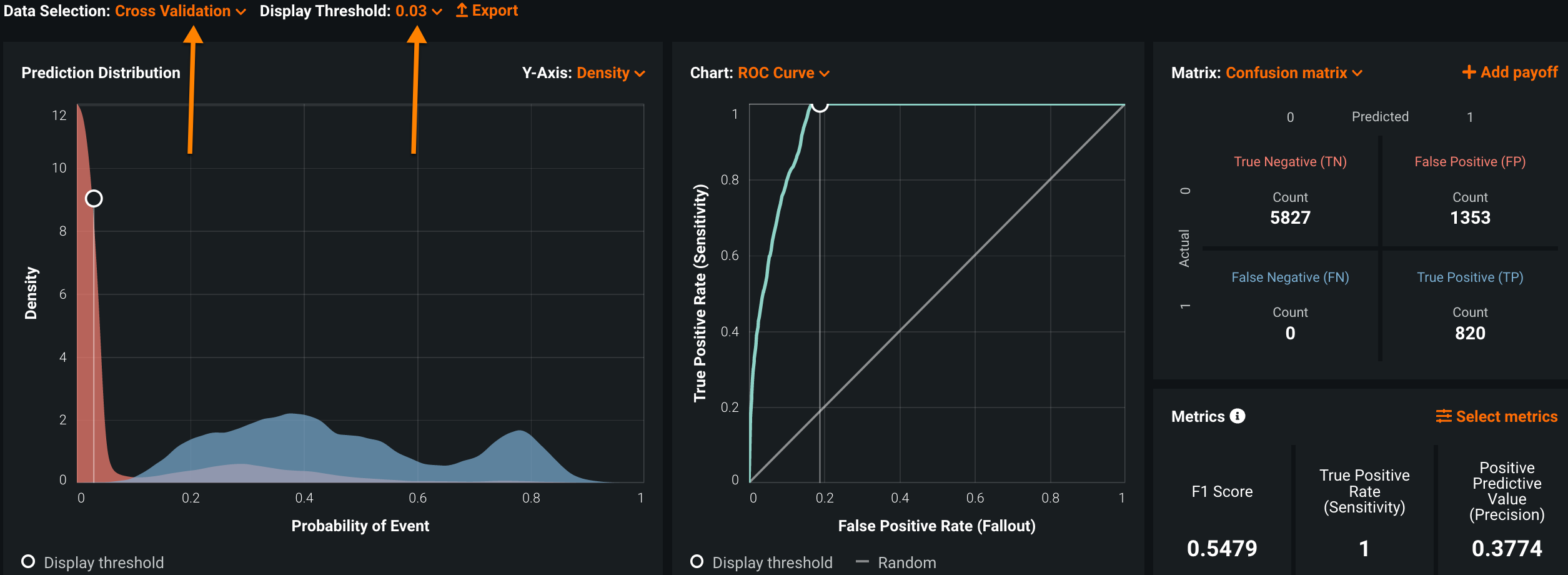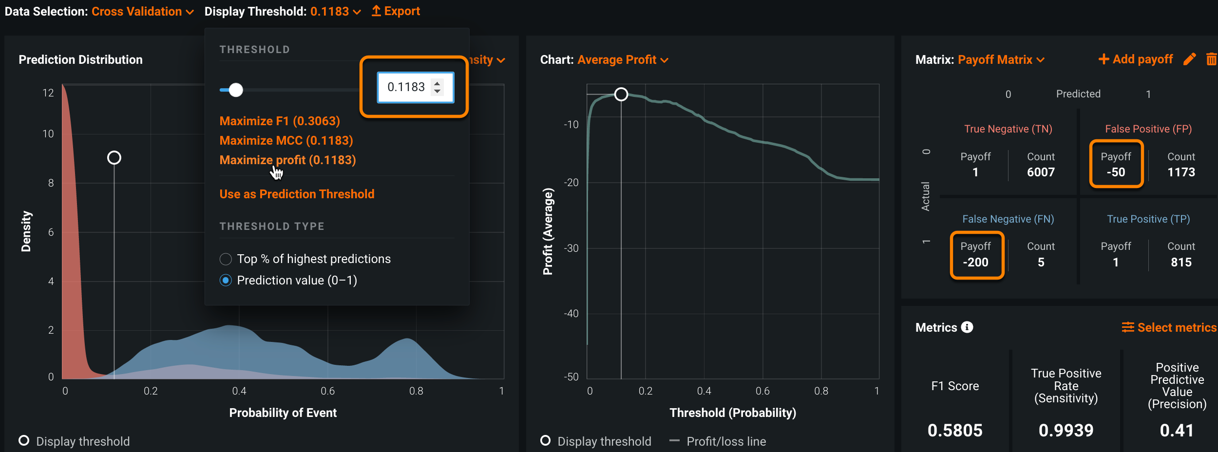 | Metrics | False Positive Rate, False Negative Rate, and Average Profit | Provides standard statistics to help describe model performance at the selected display threshold. |
