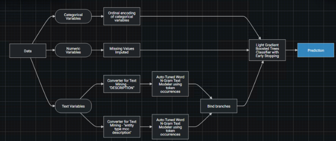The model blueprint, shown on the Leaderboard and sorted by a “survival of the fittest” scheme ranking by accuracy, shows the overall approach to model pipeline processing. The example below uses smart processing of raw data (e.g., text encoding, missing value imputation) and a robust algorithm based on a decision tree process to predict transaction riskiness. The resulting prediction is a fraud probability (0-100).
