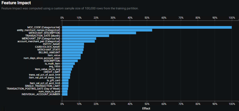 The chart provides a clear indication of over-dependence on at least one feature—Merchant Category Code (MCC). To effectively downweight the dependence, consider creating a feature list with this feature excluded and/or blending top models. These steps can balance feature dependence with comparable model performance. For example, this use case creates an additional feature list that excluded the MCC and an additional engineered feature based on MCCs recognized as high risk by SMEs.