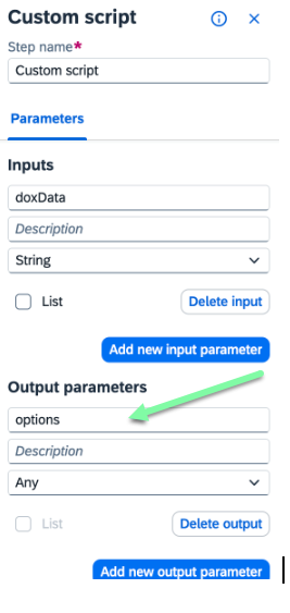 To complete the script, name the output variable that will return the DataRobot API response. Below, it is named options.
