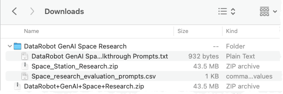 To build this experiment as you follow along, first download the file DataRobot+GenAI+Space+Research.zip and unzip the archive. Inside you will find a TXT file, a CSV file, and another ZIP file, Space_Station_Research.zip. Do not unzip this inner ZIP archive.