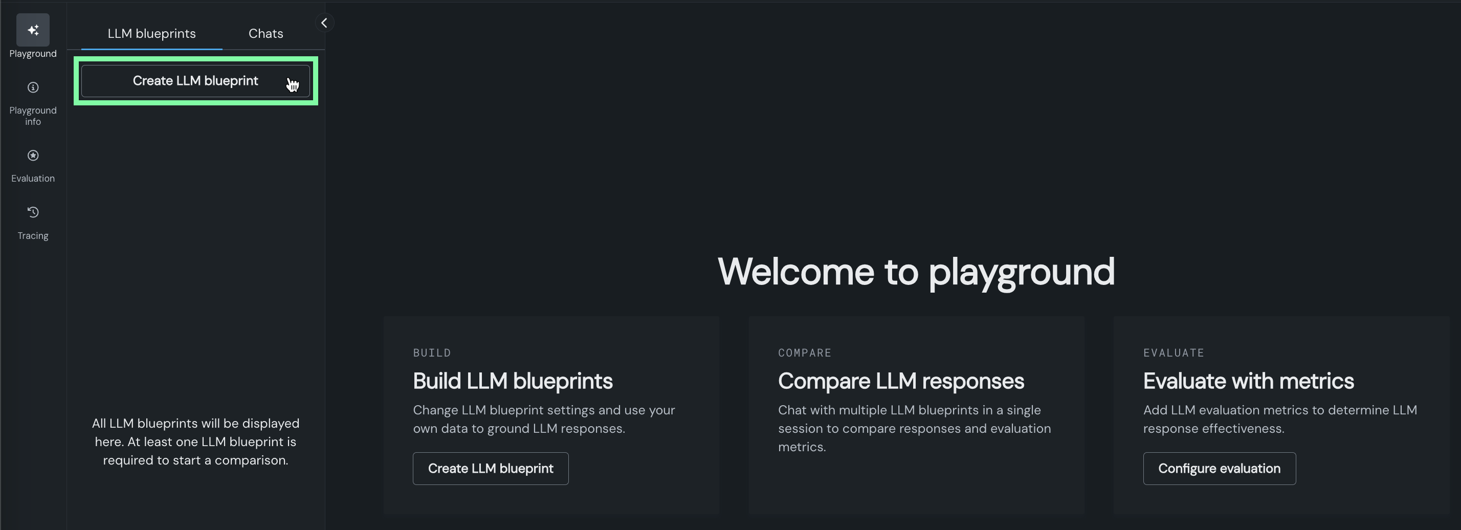 In the Playground, on the LLM blueprints panel, click Create LLM blueprint: