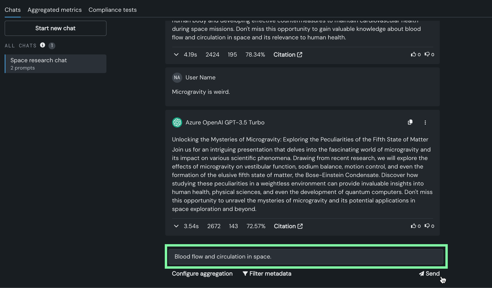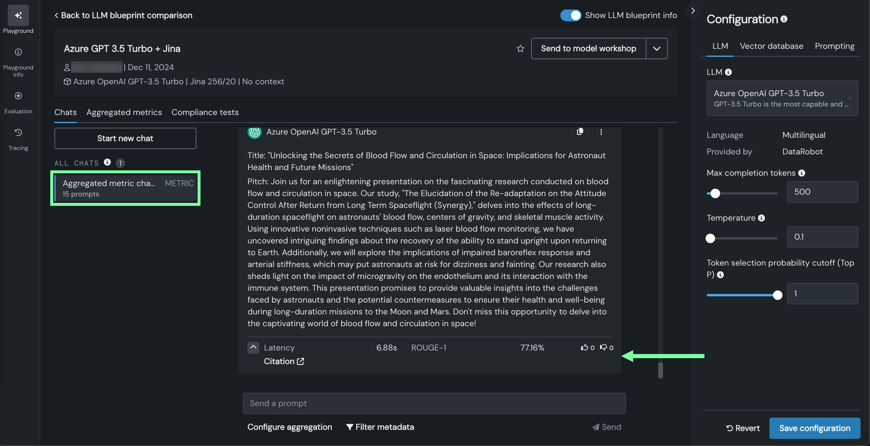 To see the row-level details that contributed to these values, click an LLM blueprint. Notice on the left panel of the Chats tab, there is an entry named Aggregated metric chat (or a different chat name, as defined in the previous section), which contains all the responses to the prompts in the evaluation dataset.