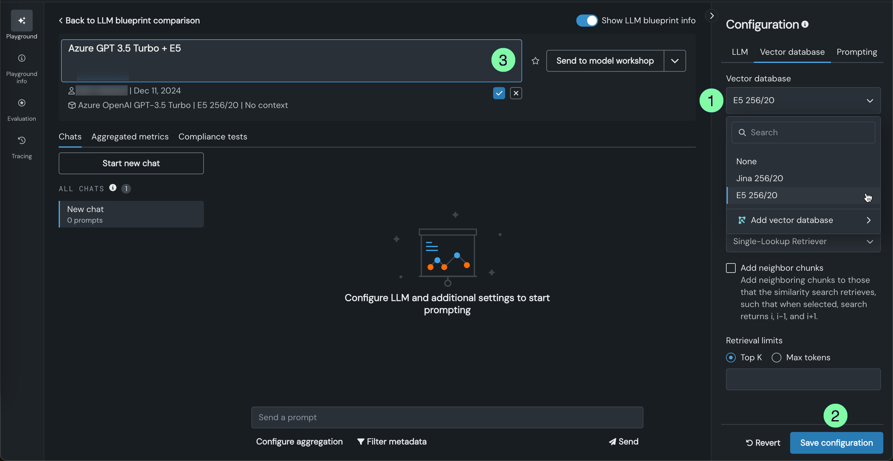 Change the vector database (1), save the configuration (2), and name the new blueprint