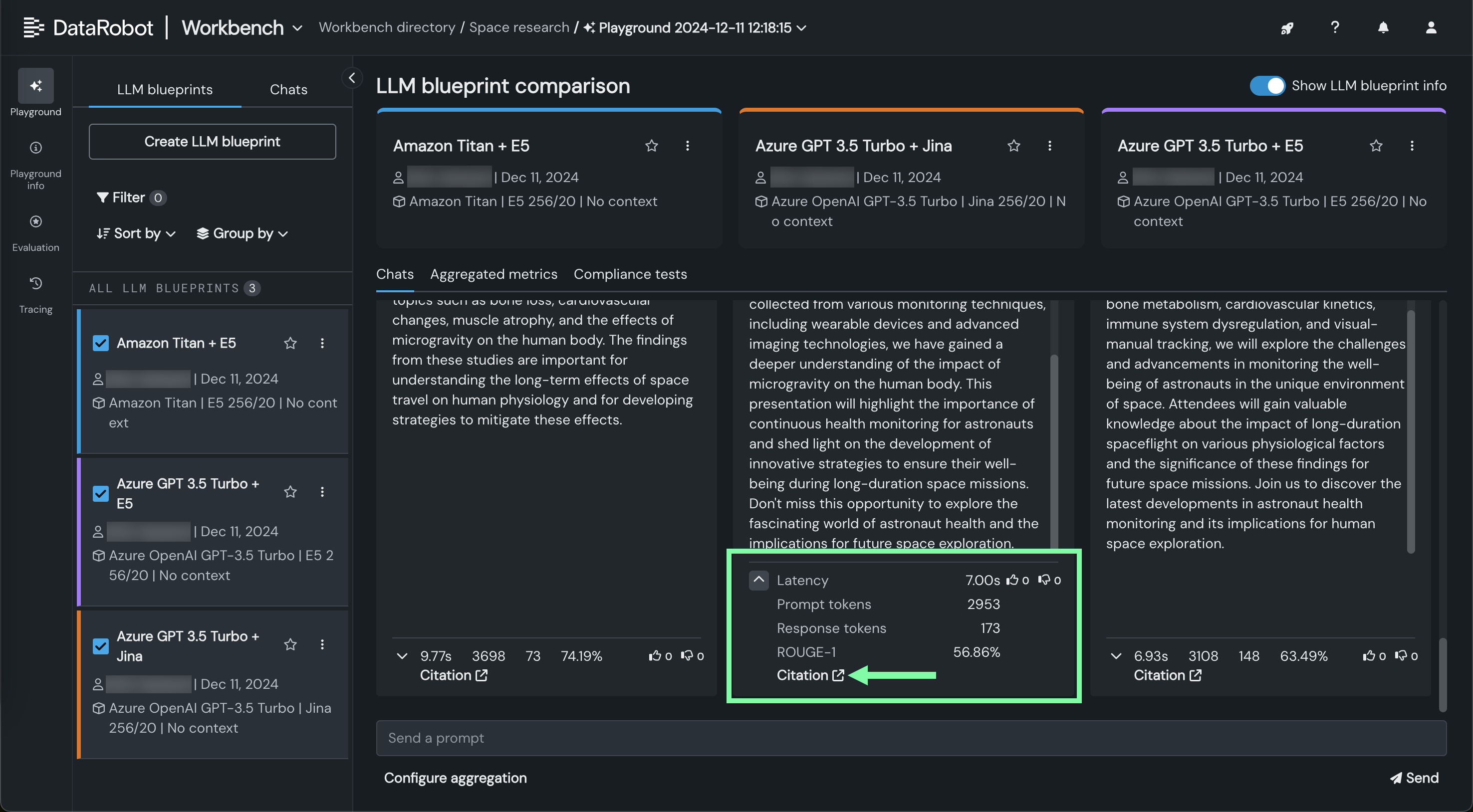 One method of evaluating a response is to look at the basic information DataRobot returns with each prompt, summarized below the response. Expand the information panel for the LLM blueprint that used the Jina vector database; you can see that the response took seven seconds, had 173 response tokens, and scored 56.86% on the ROUGE-1 confidence metric. The ROUGE-1 metric represents how similar this LLM answer is to the citations provided to aid in its generation.