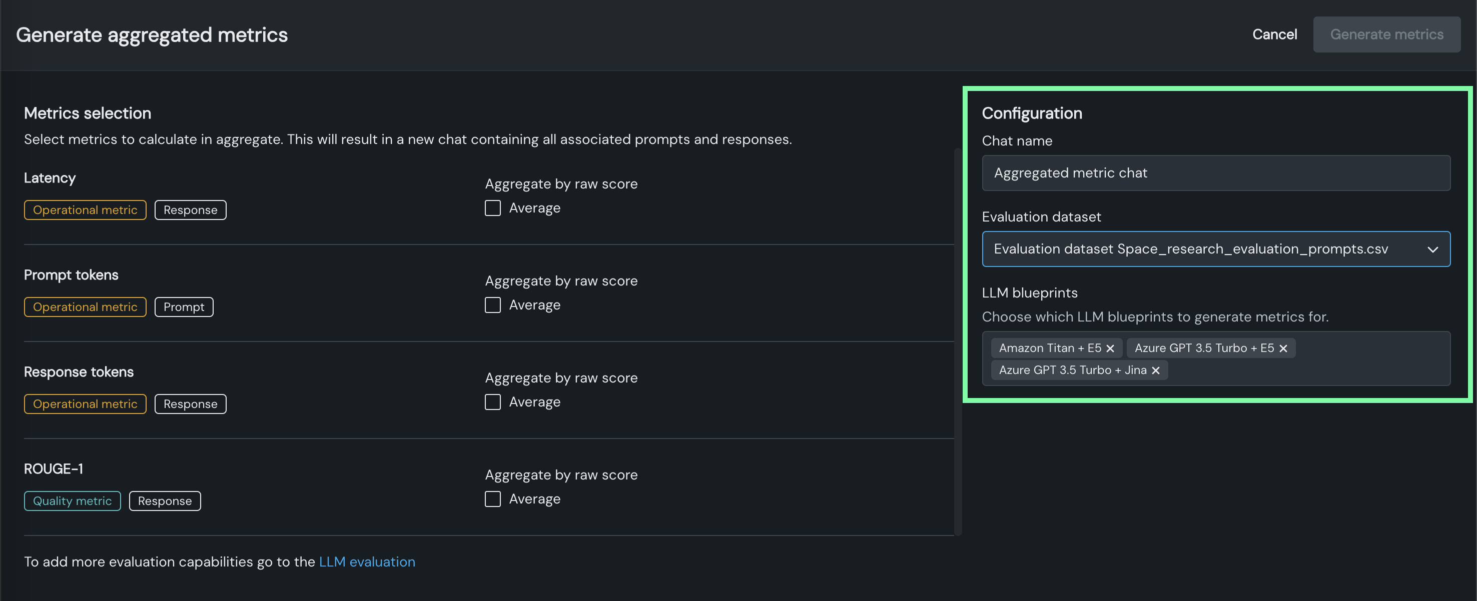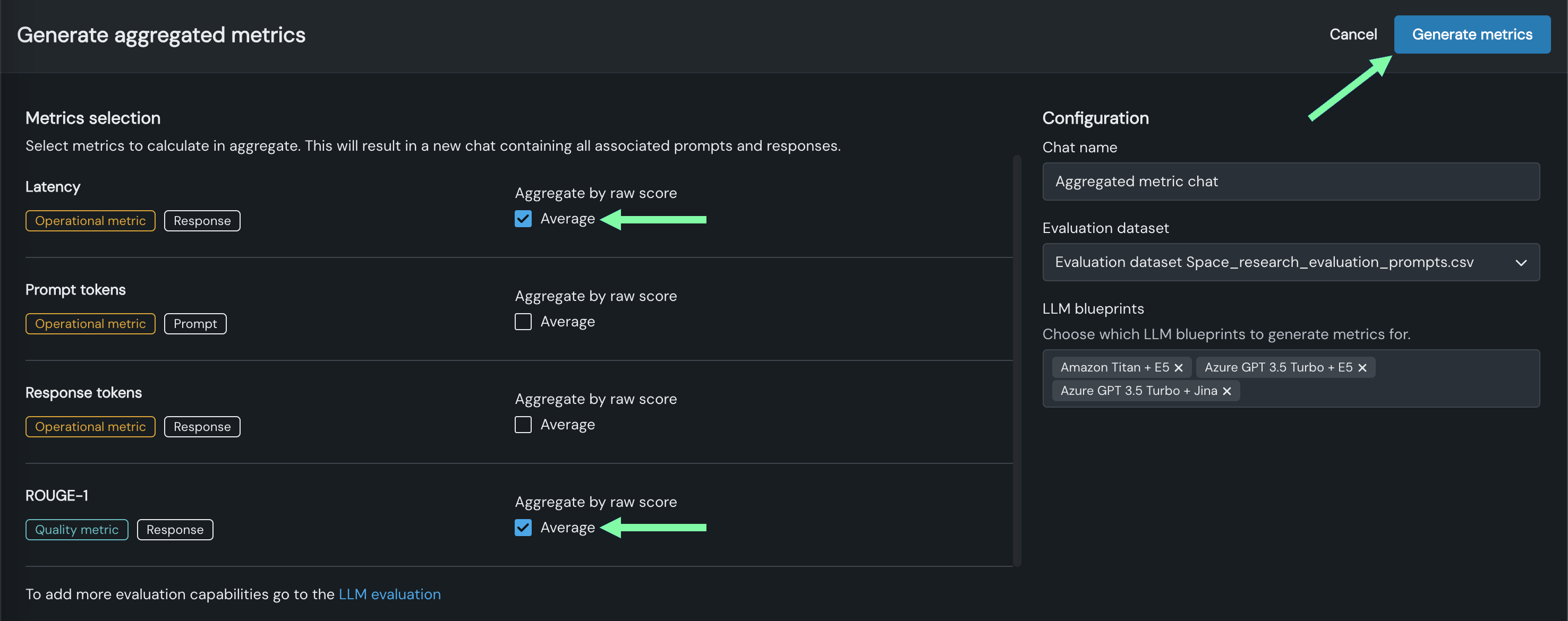 The Generate aggregated metrics page opens. Set the Latency and ROUGE-1 metrics to Average. Then, click Generate metrics.