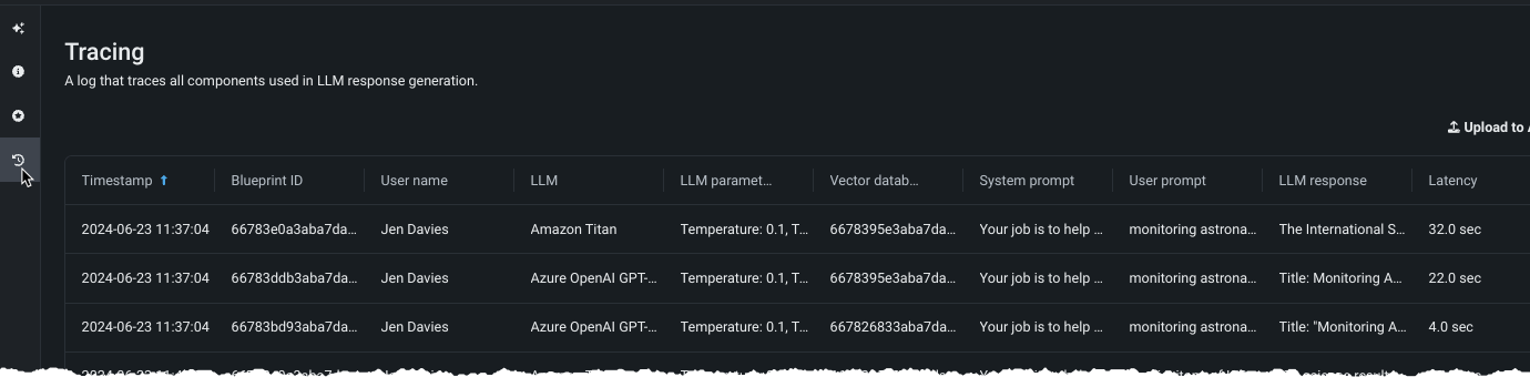 Click the Tracing icon in the upper left navigation to access a log of all the components used in the LLM response generation. The table traces exactly which LLM parameters, which vector database, which system prompt, and which user prompt resulted in a particular generated response.