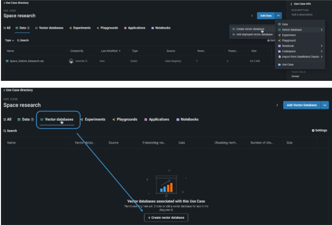 Click Create Vector Database; you are returned to the Use Case directory. While the vector database is building, add a second vector database for comparison purposes.