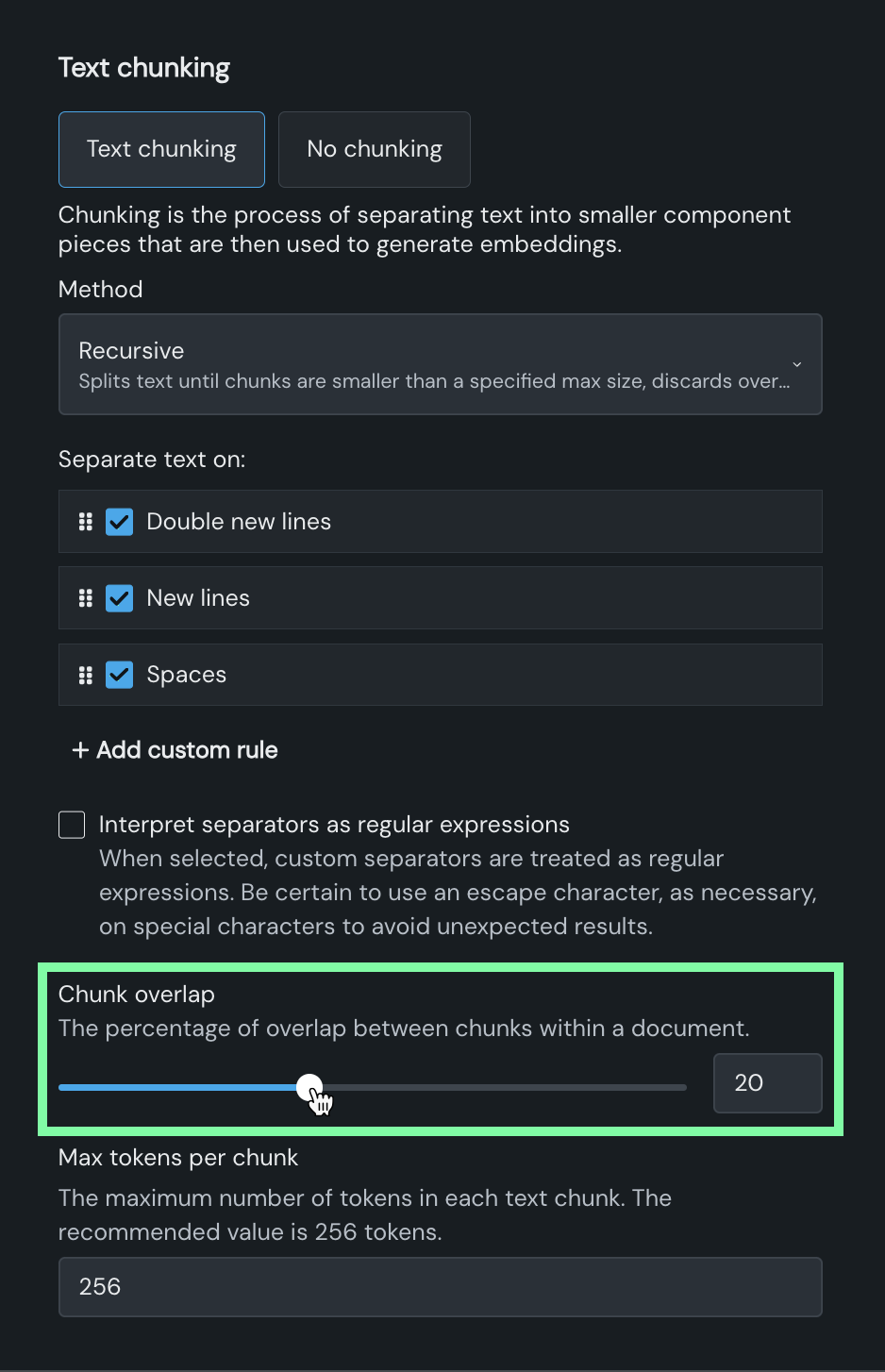 Text chunking is the process of splitting text documents into smaller text chunks that are then used to generate embeddings. You can use separator rules to divide content, set chunk overlap, and set the maximum number of tokens in each chunk. For this walkthrough, only change the chunk overlap percentage; leave Max tokens per chunk on the recommended value of 256.
