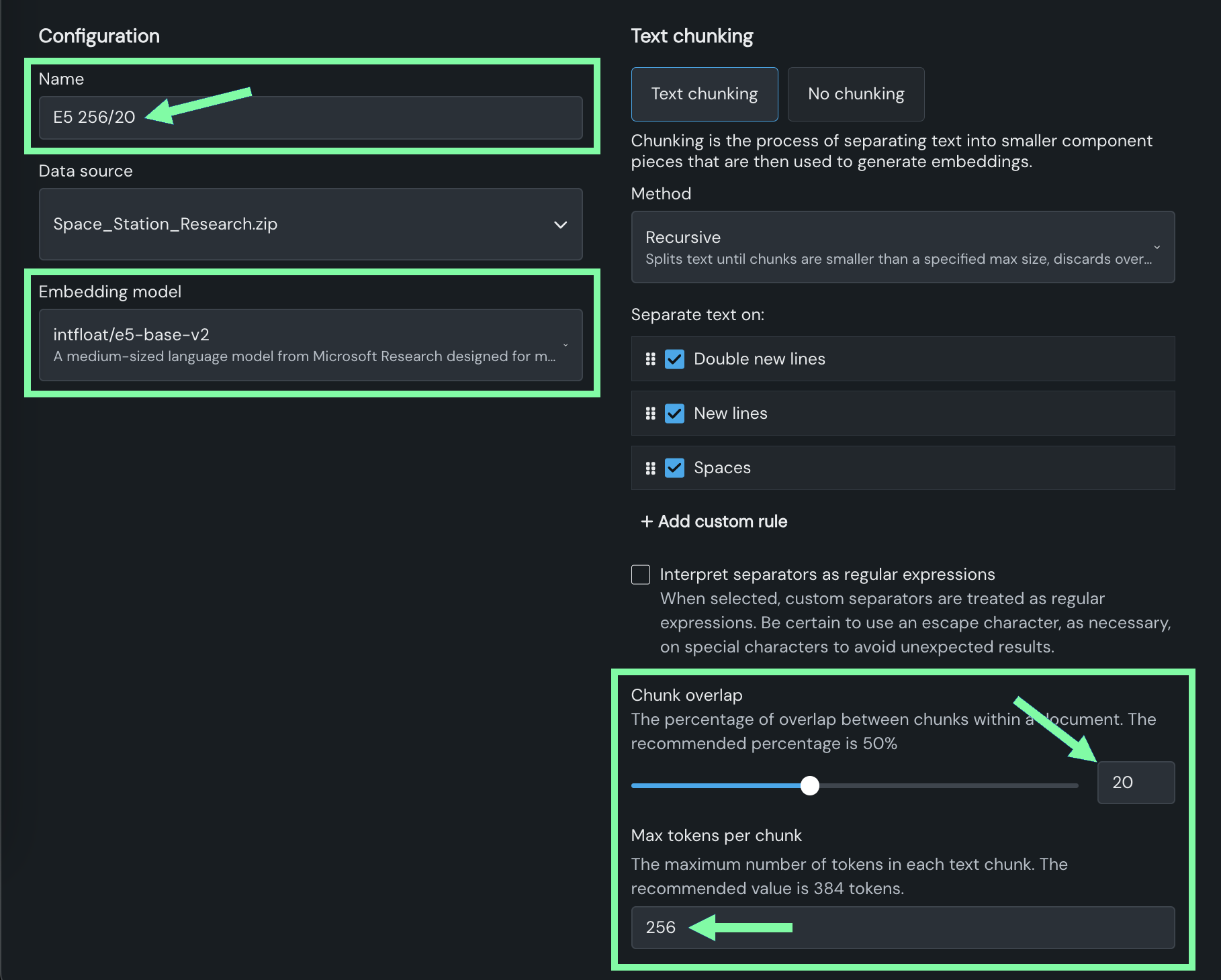 intfloat/e5-base-v2as the embedding model. To compare it against theJinamodel, make the Chunk overlap and Max tokens per chunk settings the same as those you set in step 2. That is, chunk overlap of 20% and max tokens of 256.