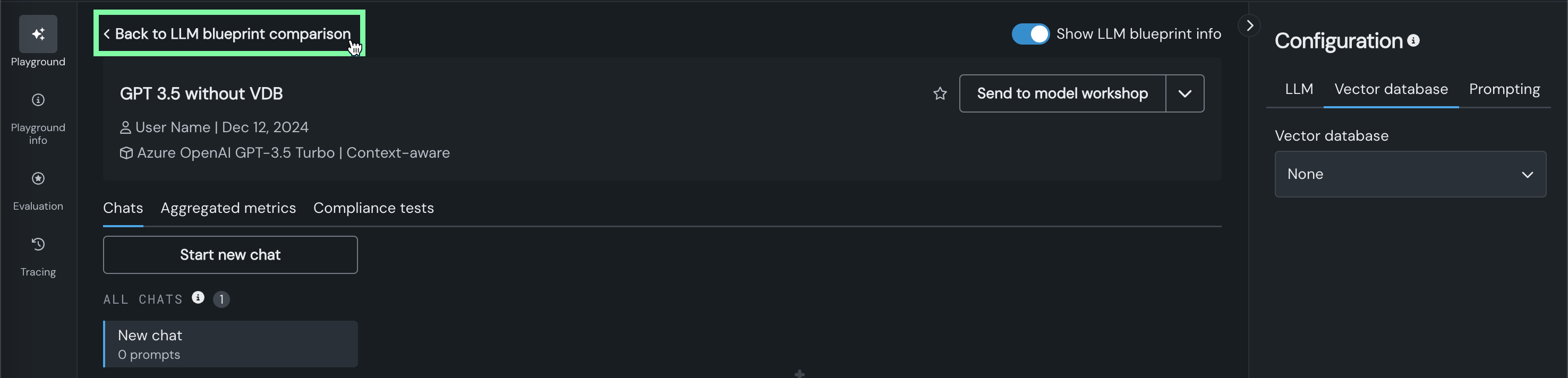 Now, with more than one LLM blueprint in your playground, you can compare responses side-by-side. Click Back to LLM blueprint comparison: