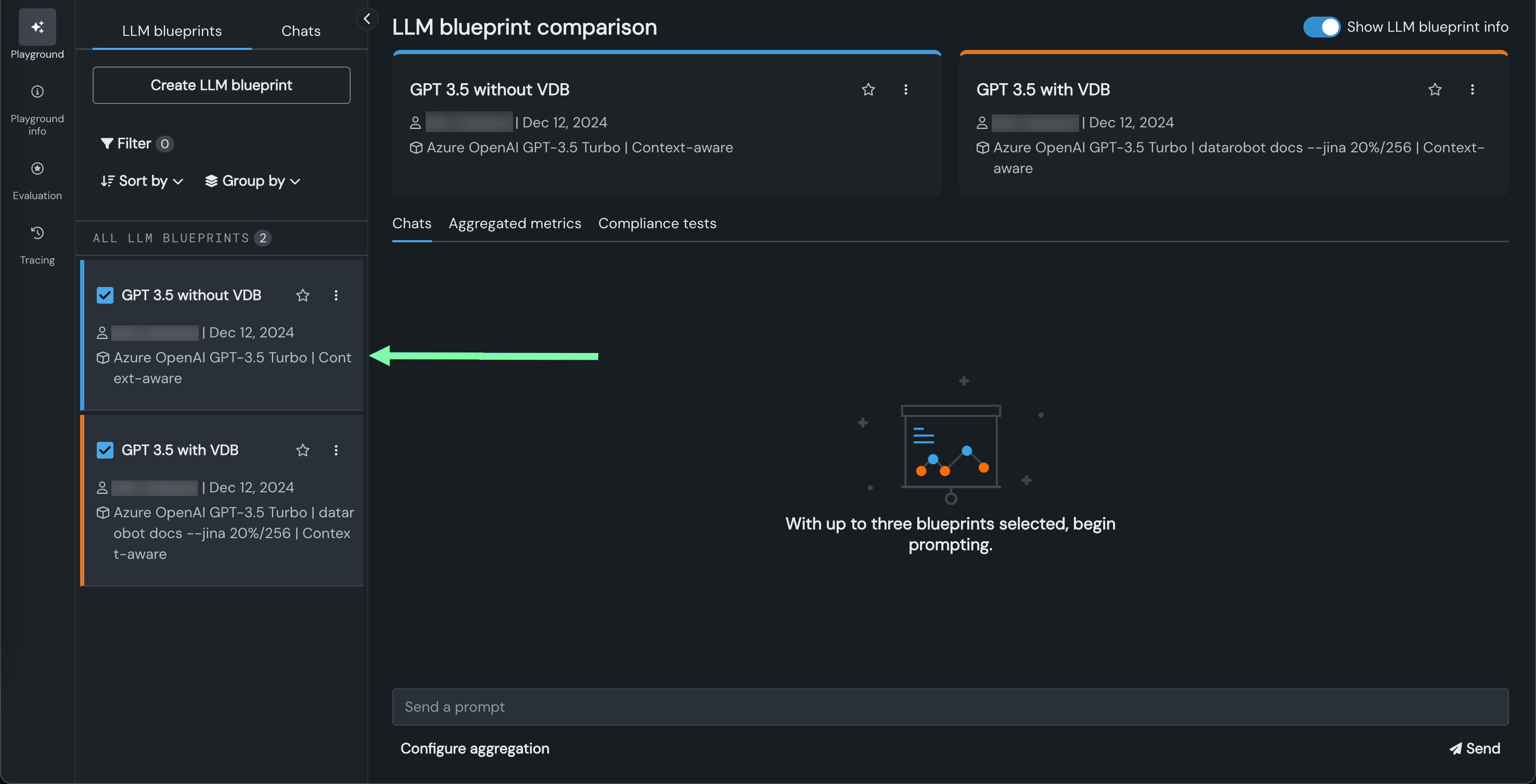 Create one or more LLM blueprints to run a comparison. (You can send prompts to a single blueprint in the comparison view.) These steps create an LLM blueprint that does not use a vector database.