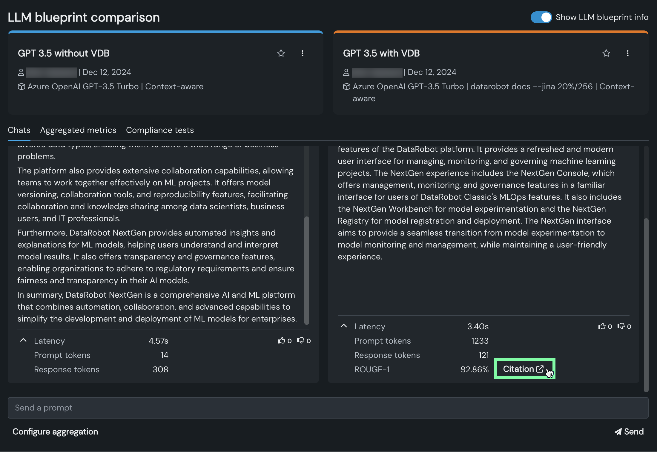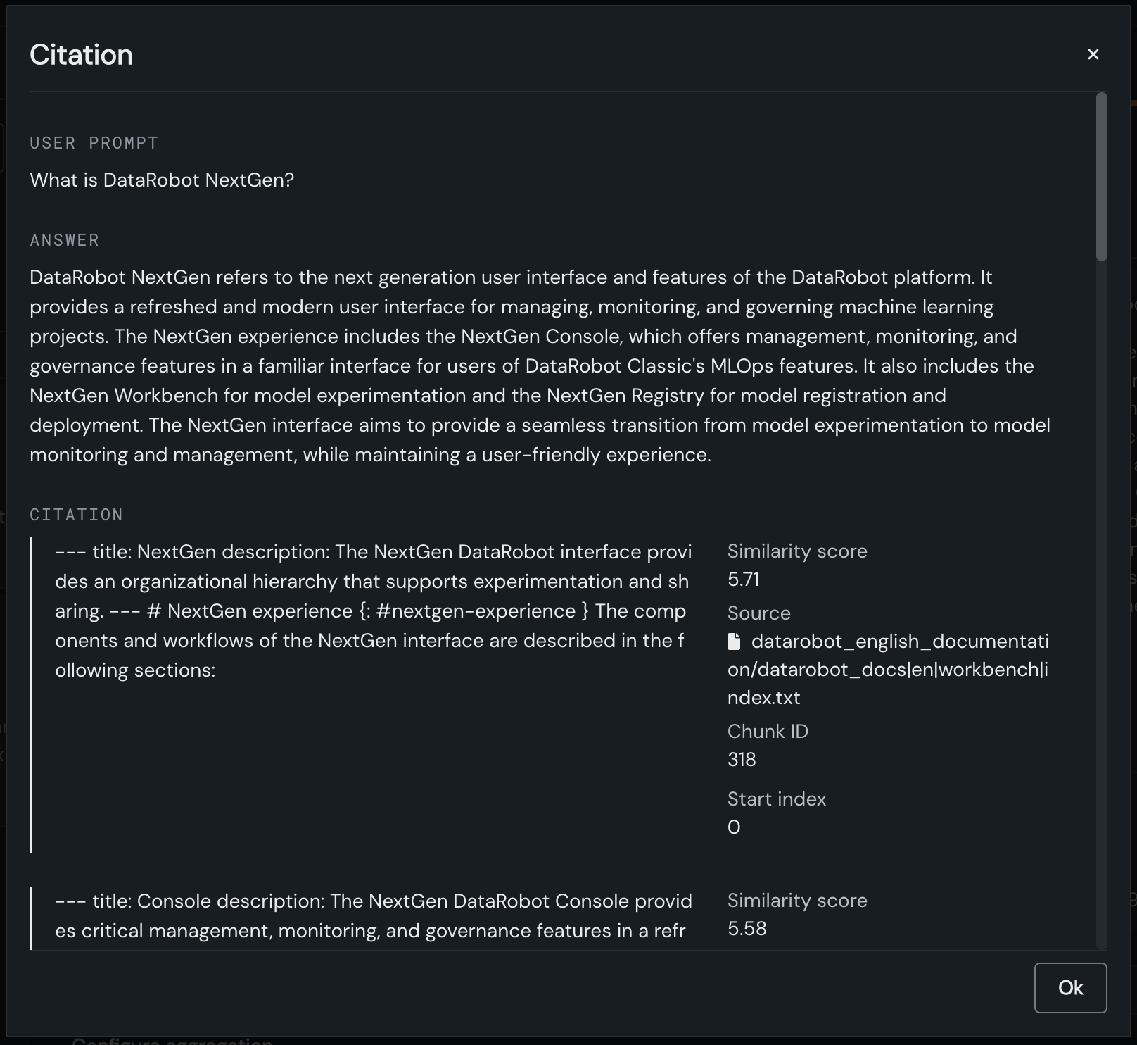 Notice that the response from the LLM blueprint that uses a vector database includes a citation link. Click the link to view the text chunks that the LLM blueprint retrieved to augment the prompt sent to the LLM.