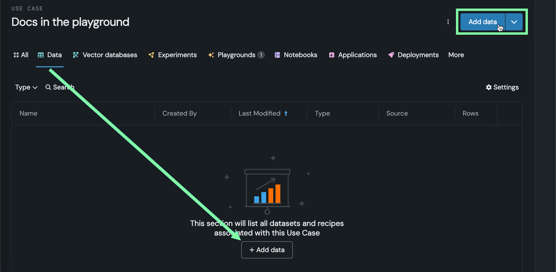 There are a variety of methods for adding a vector database. For example, from the Data tab in a Use Case: