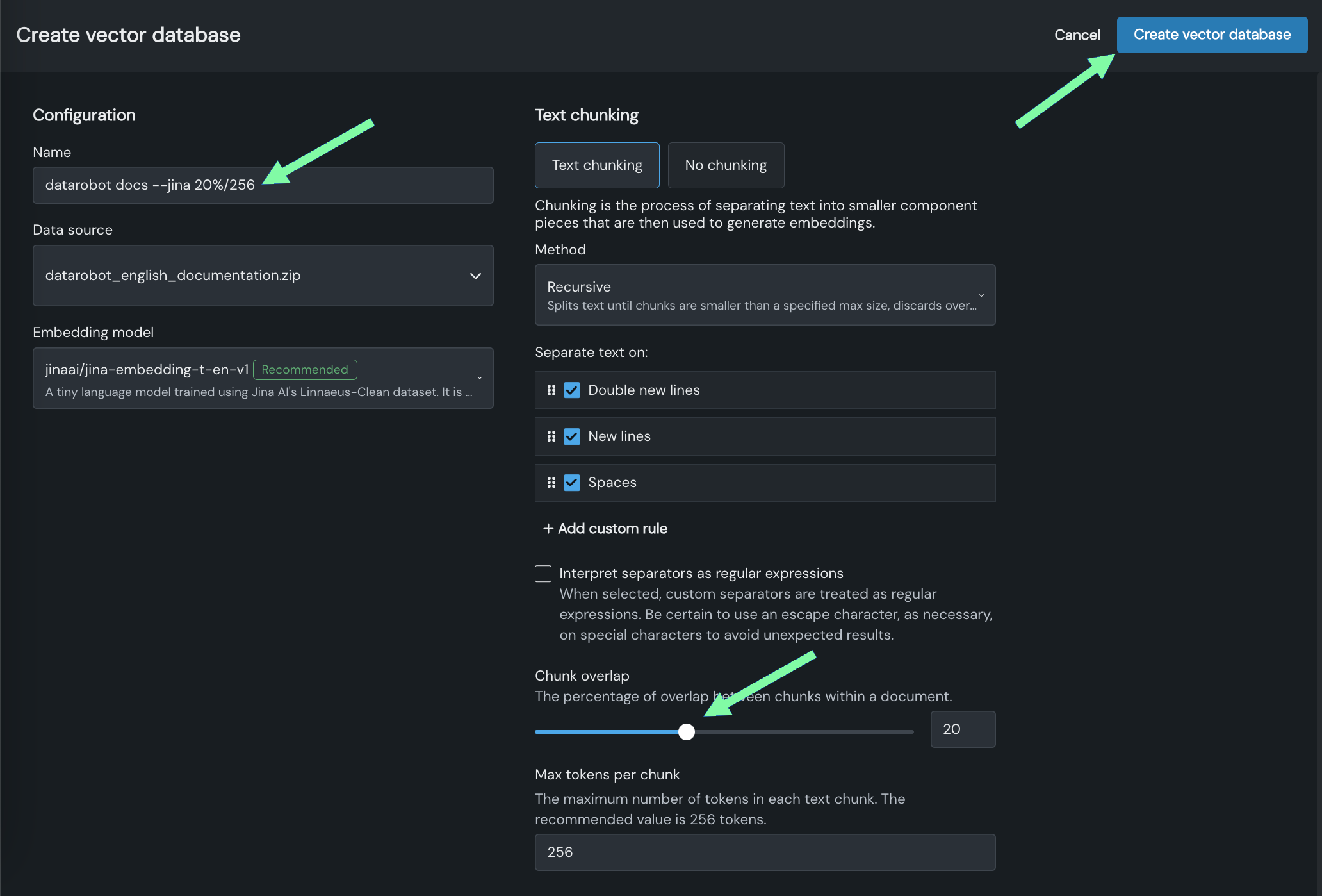 | Name | Change the vector database name to reflect the settings. | datarobot docs --jina 20% / 256 |