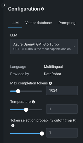 Select an LLM from the Configuration dropdown to serve as the base model. This walkthrough uses Azure OpenAI GPT-3.5 Turbo model. Optionally, modify configuration settings.