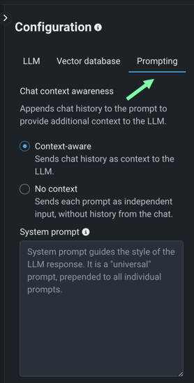 From the Prompting tab, optionally add a system prompt and change context awareness. This example leaves the blueprint configuration as context-aware, the default.