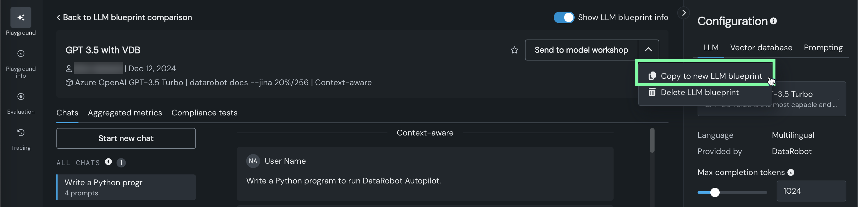 Click on the menu for the LLM blueprint you just built and select Copy to new LLM blueprint: