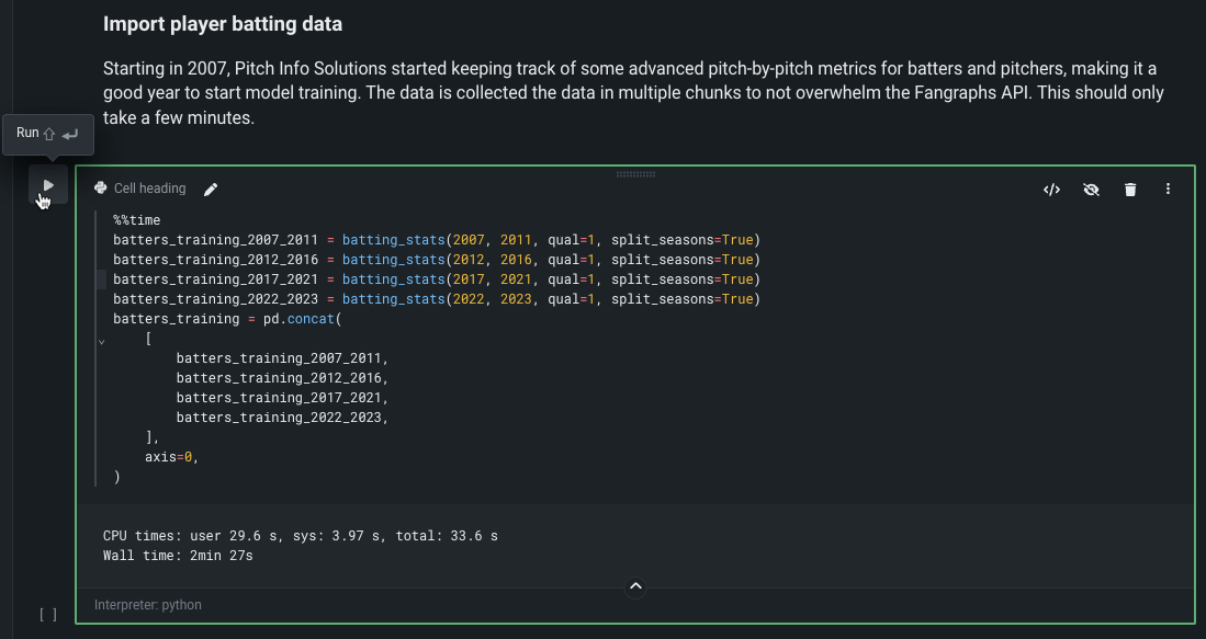 Run the "Import player batting data" cell to get the data used in this accelerator. The cells that follow structure and prepare the data for modeling.