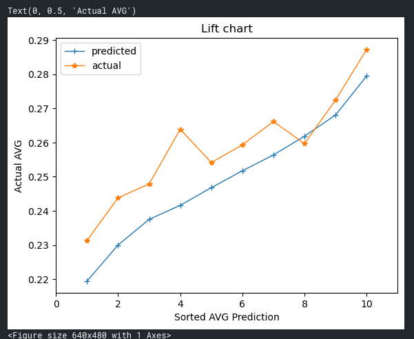 Lastly, use the code to create a Lift Chart that compares predicted batting averages to actual batting averages (actuals). The fact that the actual batting averages are running higher than the predicted batting averages is due to sampling biases. For example, only players with at least 250 plate appearances through mid-July are evaluated—the players likely being selected because they are playing better. Additionally, with only half a season of data, the volatility of outcomes is greater than hadthe model trained on a full season, inflating the highest batting averages in the chart.