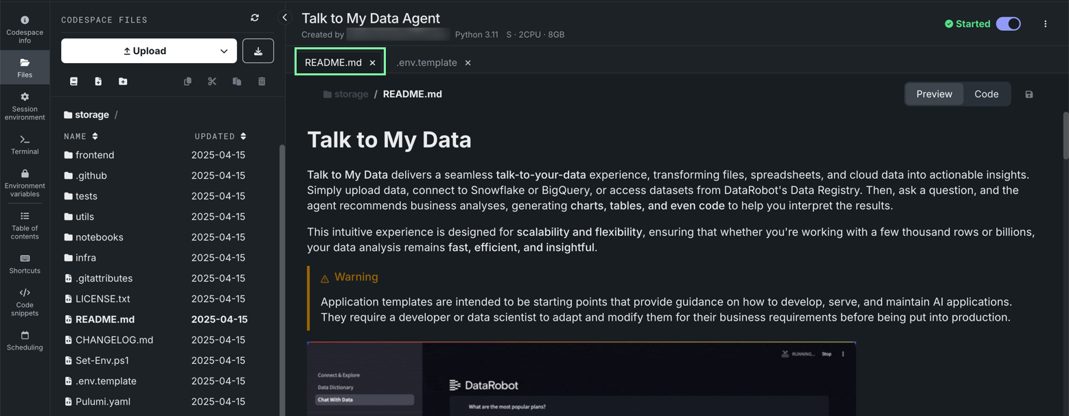 DataRobot opens and begins initializing a codespace. Once the session starts, the template files appear on the left and the README opens in the center. To learn more about the codespace interface, see Codespace sessions.