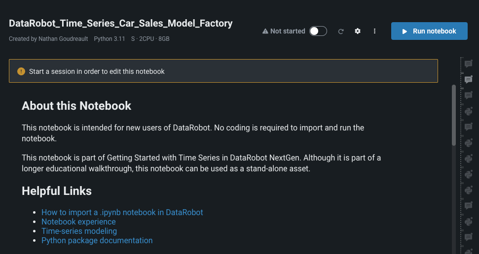 Once uploaded, the accelerator will open in DataRobot Notebooks as part of the Use Case.