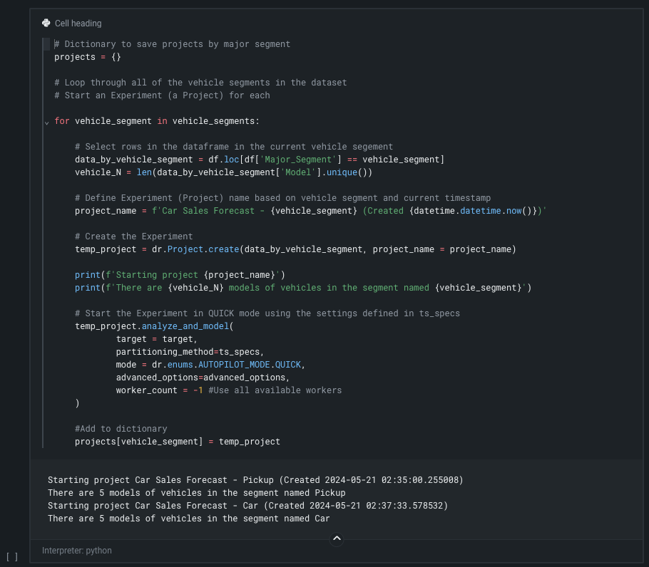 The proceeding cells creates and an experiment for each unique value of Major_Segment in the Dataframe. In this walkthrough, you will create an experiment for the Car and Pickup segments. To do so, first subset the data by the segment. Then you will assign a name for each experiment created based on the vehicle segment. These experiments will leverage the time series settings specified in previous steps. Then, you will run Autopilot again for these experiments. This cell includes a print statement to inform you of which experiment DataRobot is currently building.