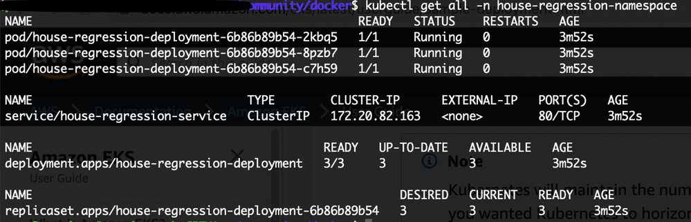 exposecommand to generate a Kubernetes service for the deployment.kubectl expose deployment house-regression-deployment -n house-regression-namespace --name=house-regression-external --type=LoadBalancer --port 80 --target-port 8080--portis the port number configured on the Load Balancer.--target-portis the port number that the deployment container is listening on.