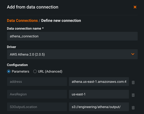For the purposes of this example, the Athena JDBC driver connection is set up to explicitly specify the address. Awsregion and S3OutputLocation (required) are also specified. Once configured, query results write to this location as a CSV file.