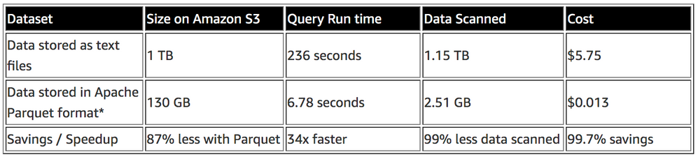 Athena also has support for compressed data in Snappy, Zlib, LZO, and GZIP formats. It charges on a pay-per-query model based on the amount of data read. AWS also provides an article on using Athena against both regular text files, as well as parquet, describing the amount of data read, time taken, and cost spent for a query: