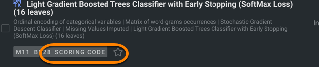 DataRobot automatically runs code generation for those models that support it, and indicates code availability with an icon on the Leaderboard.