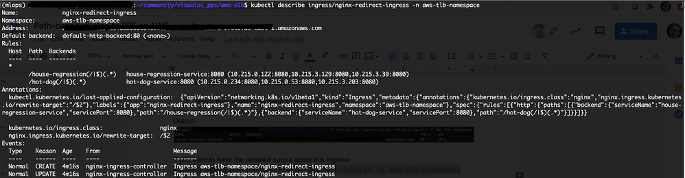 yamlfile on your local machine (in this case,nginx-redirect-ingress.yaml), replacing the values for your project, for example:apiVersion: networking.k8s.io/v1beta1 kind: Ingress metadata: name: nginx-redirect-ingress namespace: aws-tlb-namespace annotations: kubernetes.io/ingress.class: nginx nginx.ingress.kubernetes.io/rewrite-target: /$2 labels: app: nginx-redirect-ingress spec: rules: - http: paths: - path: /house-regression(/|$)(.*) backend: serviceName: house-regression-service servicePort: 8080 - path: /hot-dog(/|$)(.*) backend: serviceName: hot-dog-service servicePort: 8080Note