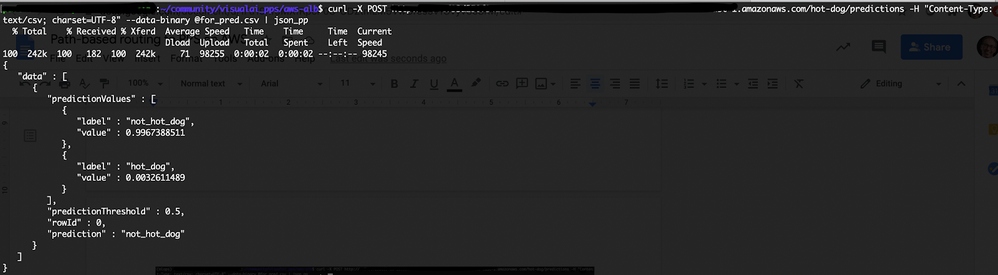 curl -X POST http://<ADDRESS>/hot-dog/predictions -H "Content-Type: text/csv; charset=UTF-8" --data-binary @for_pred.csvNote