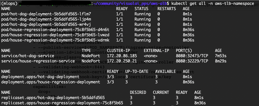 yamlfile on your local machine (in this case,hot-dog-deployment.yaml), replacing the values for your project, for example:apiVersion: apps/v1 kind: Deployment metadata: name: hot-dog-deployment namespace: aws-tlb-namespace labels: app: hot-dog-app spec: replicas: 3 selector: matchLabels: app: hot-dog-app template: metadata: labels: app: hot-dog-app spec: affinity: nodeAffinity: requiredDuringSchedulingIgnoredDuringExecution: nodeSelectorTerms: - matchExpressions: - key: beta.kubernetes.io/arch operator: In values: - amd64 containers: - name: hot-dog-model image: <your_image_in_ECR> ports: - containerPort: 80 -