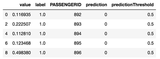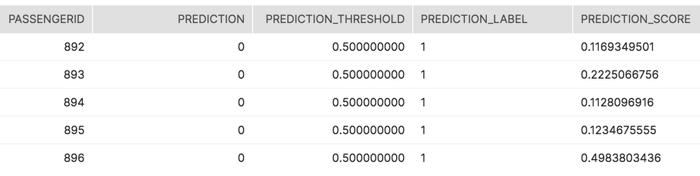 You can use a raw score and the output it provides against the threshold. In this example, passenger 892's chance of survival (11.69%) was less than the 50% threshold. As a result, the prediction towards the positive class survival label 1 was 0 (i.e., non-survival).